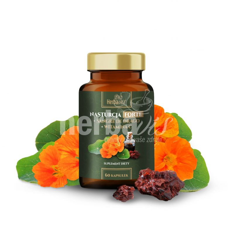SKŁAD: Nasturcja większa (Tropaeolum majus) – standaryzowany ekstrakt z całej rośliny (10:1), witamina C (kwas L-askorbinowy), ekstrakt z żywicy Sangre de drago (Croton lechleri Muell. Arg.), celuloza mikrokrystaliczna, stearynian magnezu, wegetariańska kapsułka (HPMC).